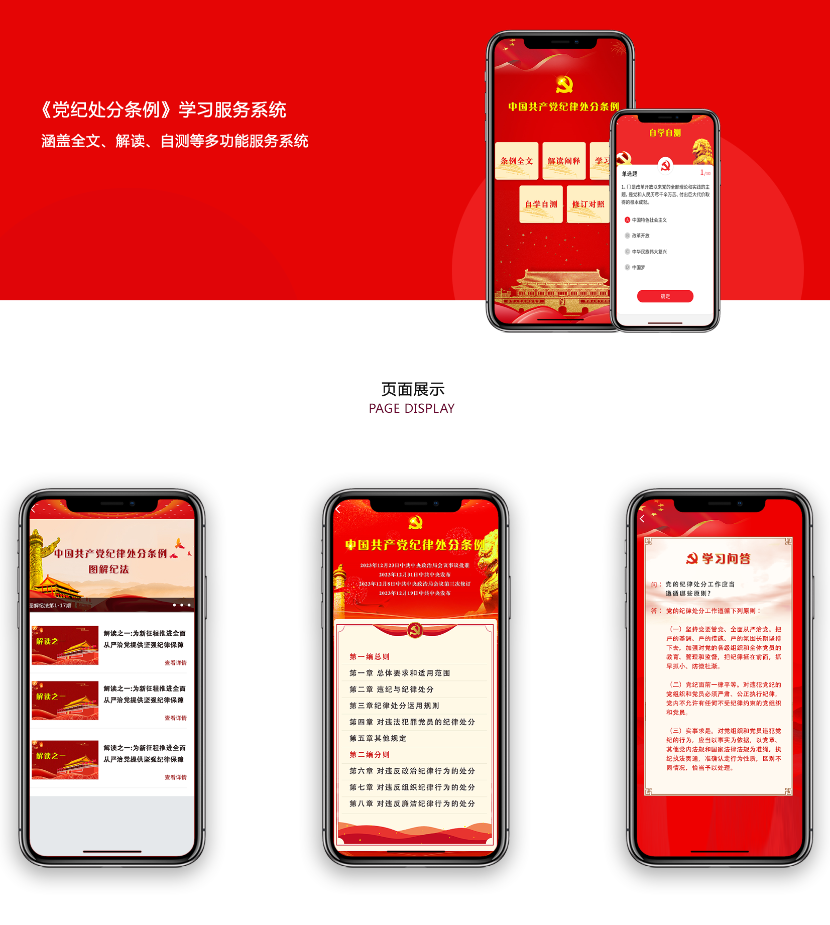 這是一款為 XX 黨政機(jī)關(guān)量身打造的《中國共產(chǎn)黨紀(jì)律處分條例》學(xué)習(xí)服務(wù)系統(tǒng),集條例全文、解讀闡釋、學(xué)習(xí)問答、自學(xué)自測、修訂對照等功能于一體,助力黨政機(jī)關(guān)工作人員全方位、便捷化學(xué)習(xí)黨紀(jì)處分條例,強(qiáng)化紀(jì)律意識,推動(dòng)黨紀(jì)學(xué)習(xí)在黨政機(jī)關(guān)走深走實(shí)。